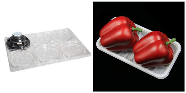 如圖所示的是吸塑托盤,吸塑托盤或用于五金電子零配件的運輸作用,防止產品在運輸過程中掉落或者刮擦等,用于大型超市、農場、餐飲連鎖店等食品打包、零售。材料一般為PVC、PET或者PP。