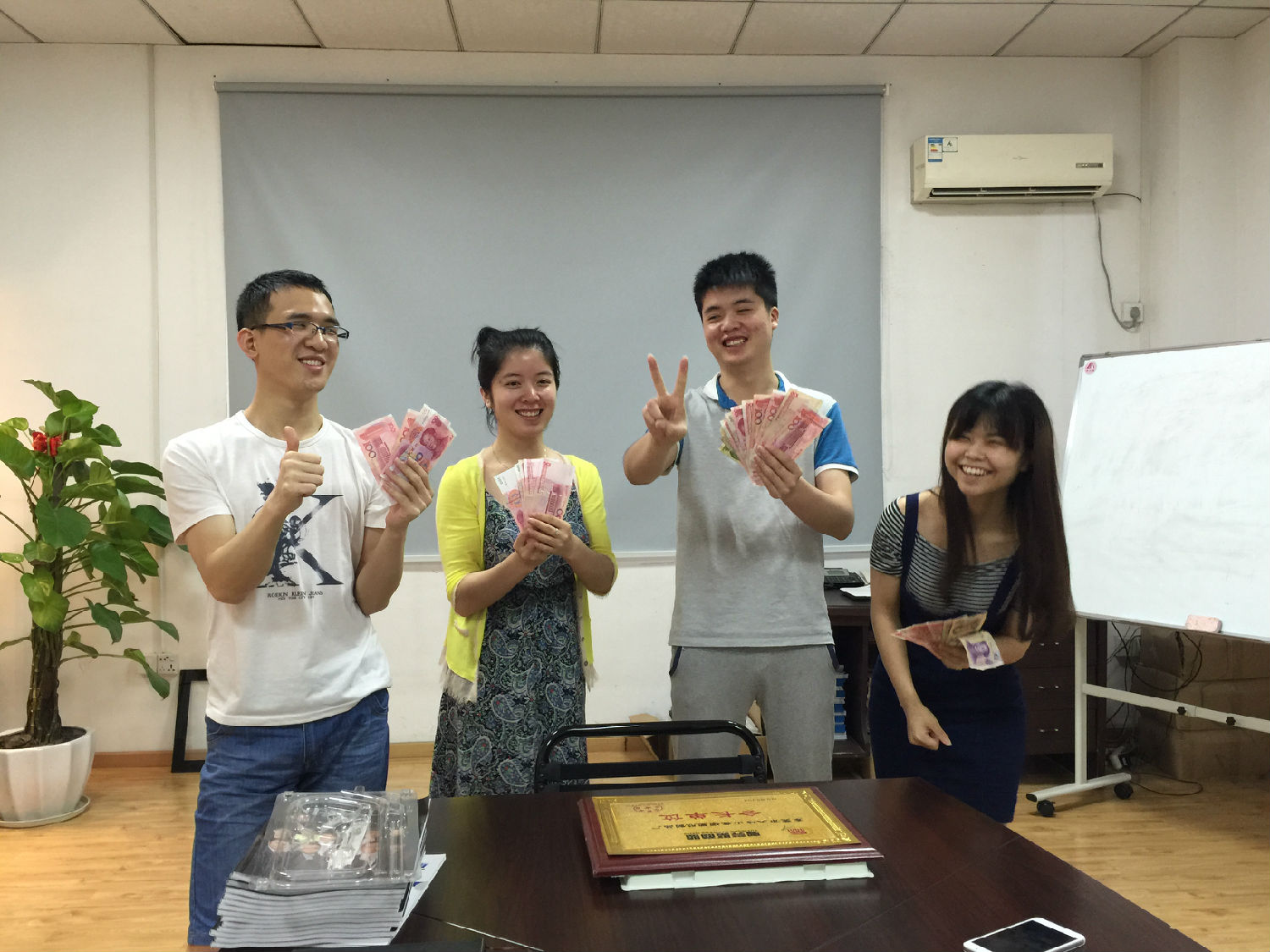 在英碩工作很開心,每天被這種工作氣氛所感染,而且每個人都非常能干,看這周我們拿獎金的伙伴,開心的合不攏嘴,要請客喲,第一位帥哥是負責我們公司網絡運營的,他有非常強的網絡實戰經驗,我們公司高大上的網站就是出自他的手,中間這位美女是我們外貿部的伍姐姐,英文水平一流,而且還是外貿業務成交高手,看她與外國客戶溝通起來真誠自信的表情,真是好生羨慕呀,第3位是負責阿里巴巴平臺的推廣工作,我們阿里超級旺鋪就是他的功勞啦 ,最后一位小美女是我們跟單業務和售后服務,她的甜美聲音可是迷到一大片哦。下周拿獎金的又會是那些人呢?做為一個新人,也要給自己定個目標,個月也要拿獎,不然跟不上大伙的步伐呀。